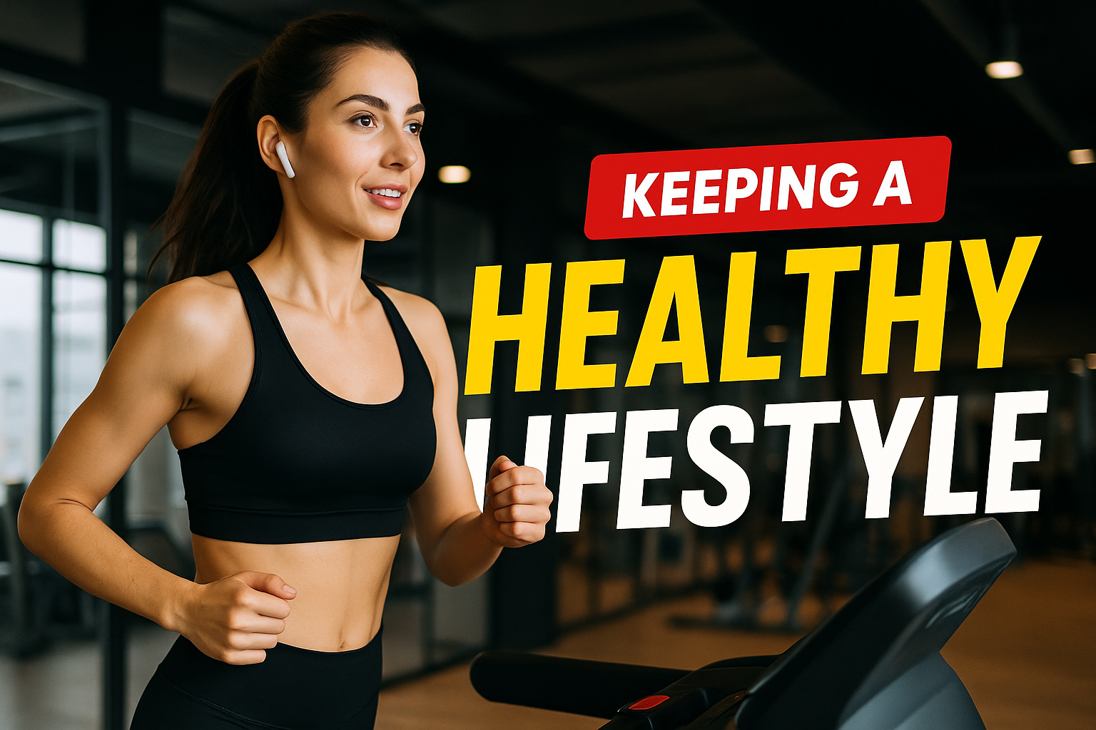 /Collection: /by davooda/Type: PNG/Vibrant fitness-themed graphic showcasing a woman running on a treadmill, conveying a message about maintaining a healthy lifestyle. Ideal for wellness-related marketing.