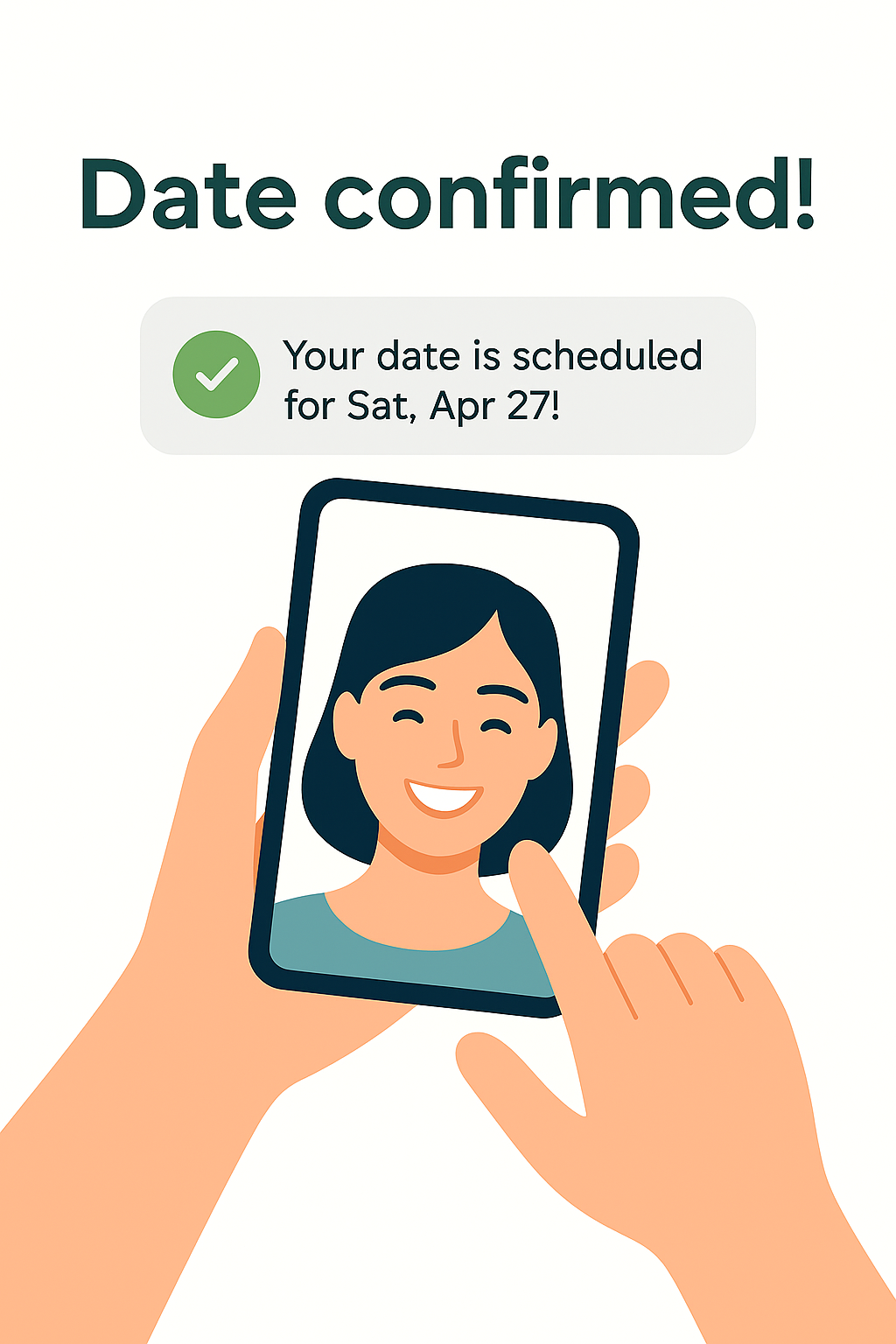 Illustrative graphic featuring a person confirming a date on a mobile device. The design is modern and colorful, suitable for dating apps or event scheduling services.