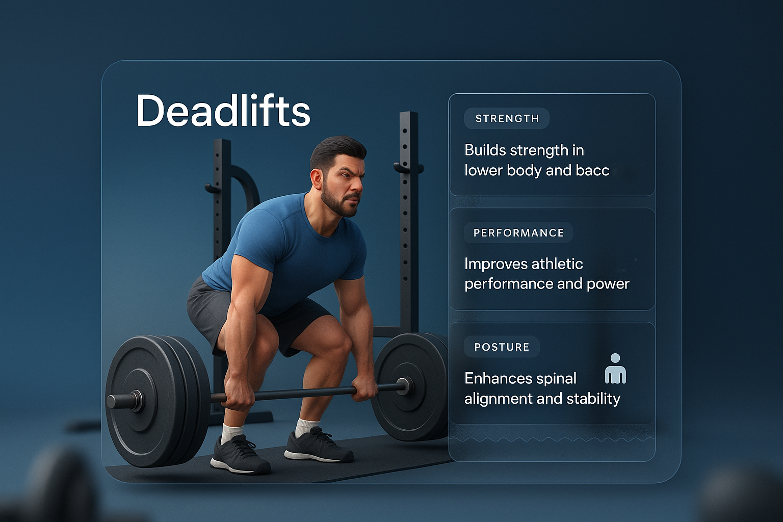 /Collection: /by davooda/Type: PNG/A dynamic 3D illustration showcasing a man performing deadlifts. The background features a smooth gradient, with text blocks highlighting strength, performance, and posture benefits.