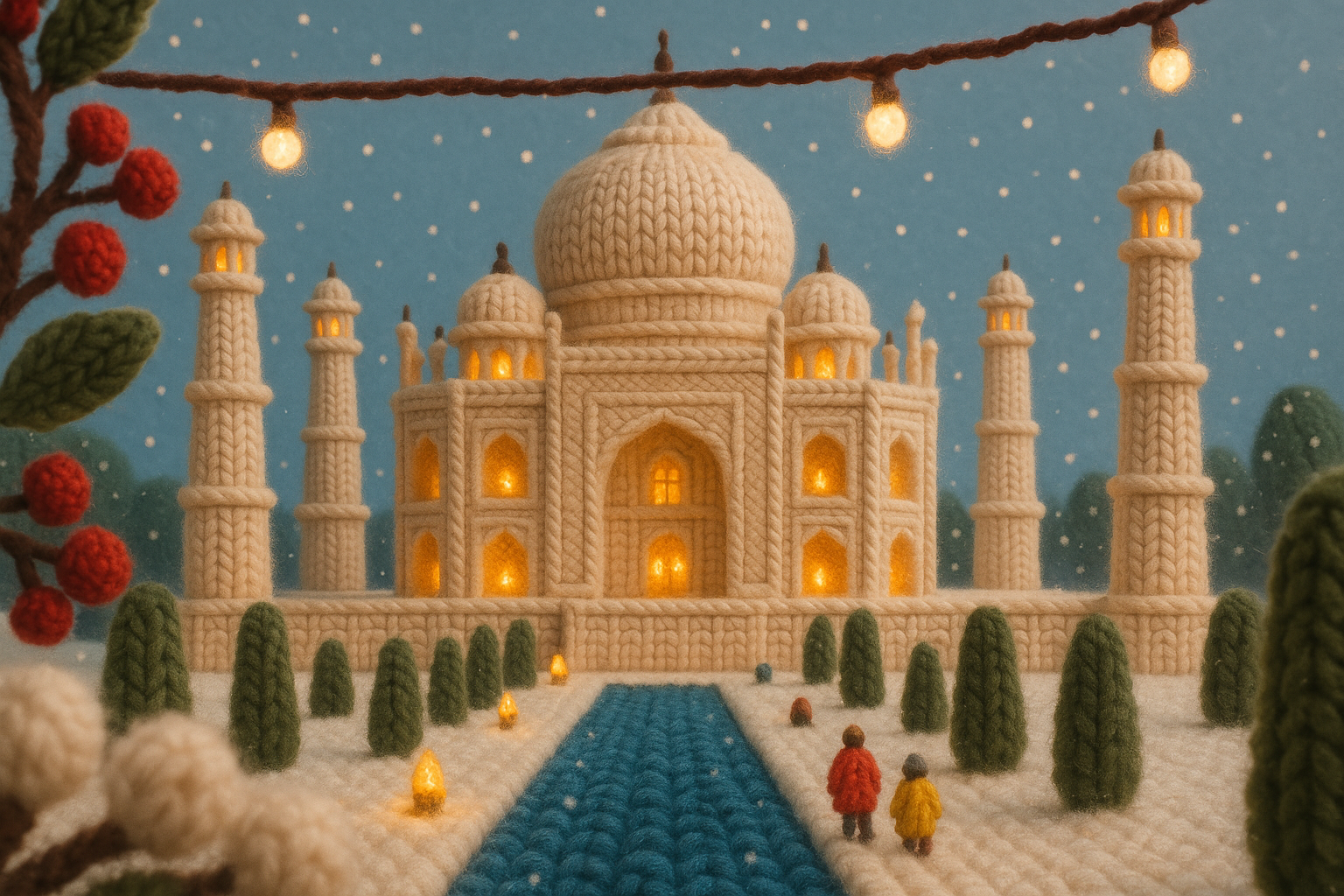 A whimsical representation of the Taj Mahal made from thick yarn, set in a snowy landscape with lights and tiny figures, evoking a cozy holiday atmosphere.