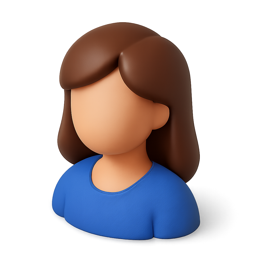 A stylized 3D icon featuring a brunette figure with a simple, isometric design. The character has a smooth, rounded head and a blue shirt, presented in a three-quarter view.