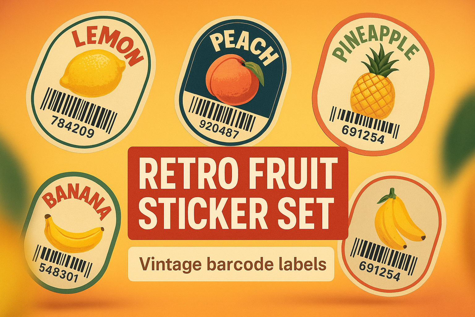 Colorful graphic featuring a set of vintage fruit sticker designs with barcodes, ideal for retro-themed projects or marketing materials.