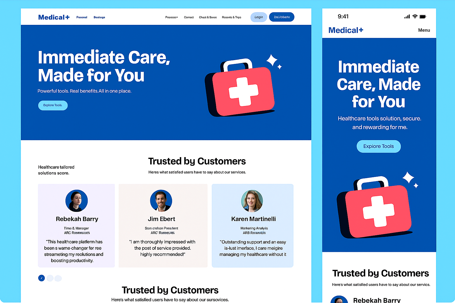 A visually appealing testimonials section for the Medical+ website, featuring user avatars, credentials, and quotes. It showcases customer trust and engagement.