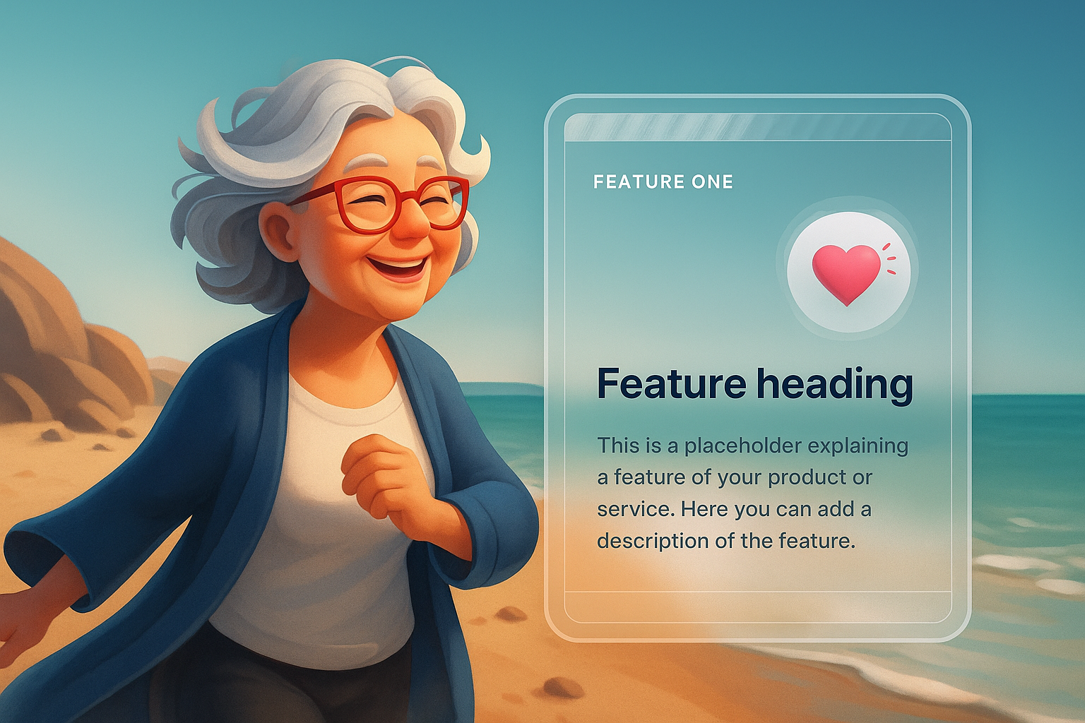 /Collection: /by davooda/Type: PNG/A lively illustration of a senior woman joyfully walking along a beach. The image includes a transparent feature block showcasing a heading and description, integrated into the scene.