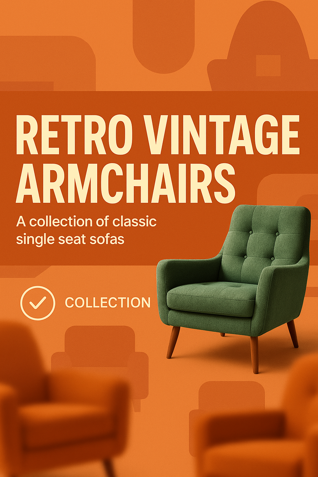 Promotional graphic showcasing a collection of retro vintage armchairs, featuring bold typography and warm color palette, ideal for furniture marketing.