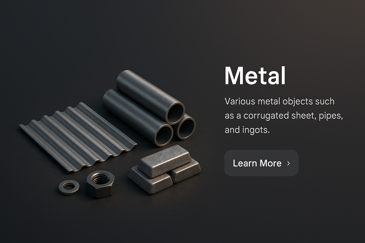 A detailed 3D representation of various metal objects like sheets, pipes, and ingots set against a dark gradient background, featuring clear text elements and a call-to-action.
