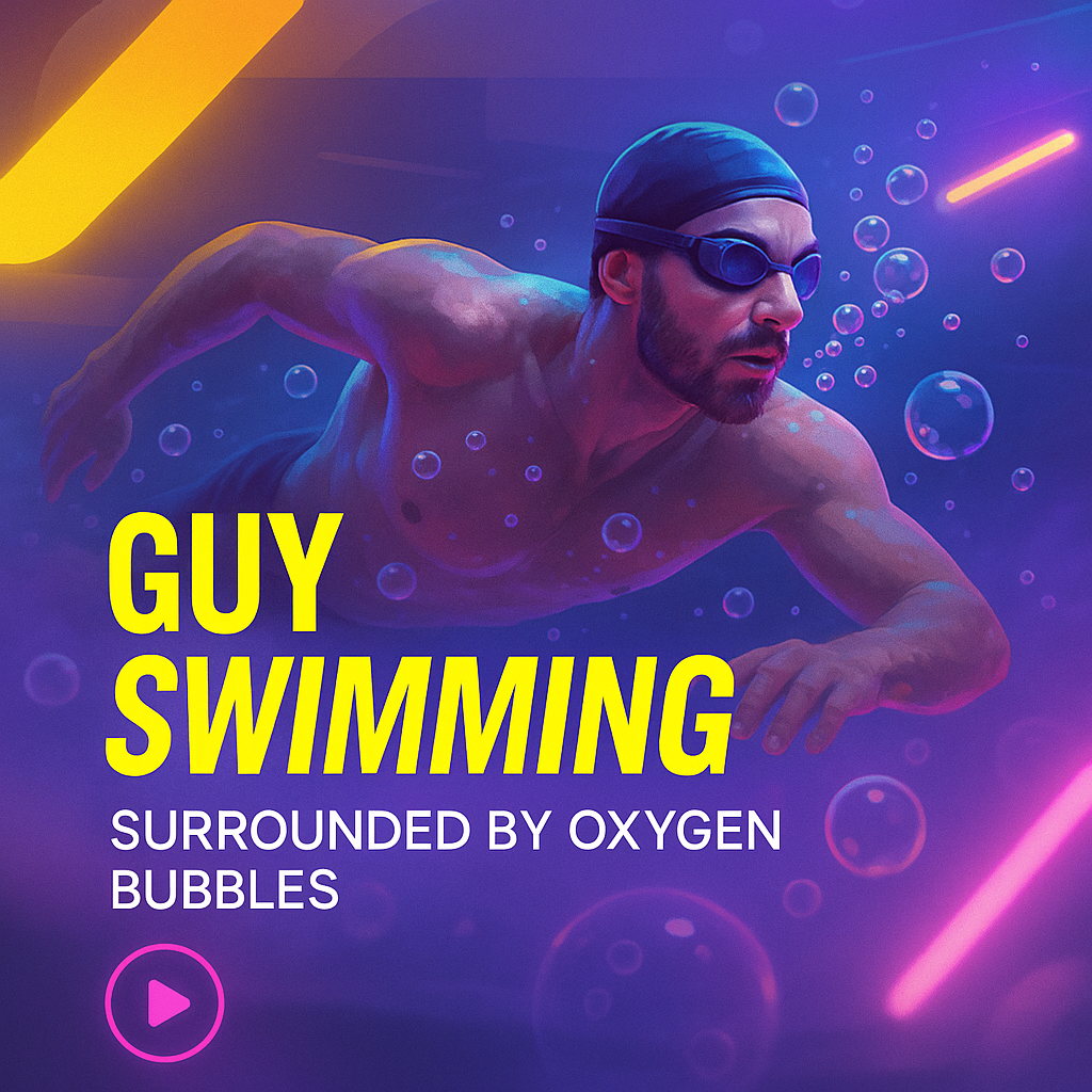 /Collection: /by davooda/Type: PNG/A vibrant digital illustration depicting a man swimming underwater, surrounded by bubbles. The design features neon colors and dynamic lighting, ideal for sports or health-related content.
