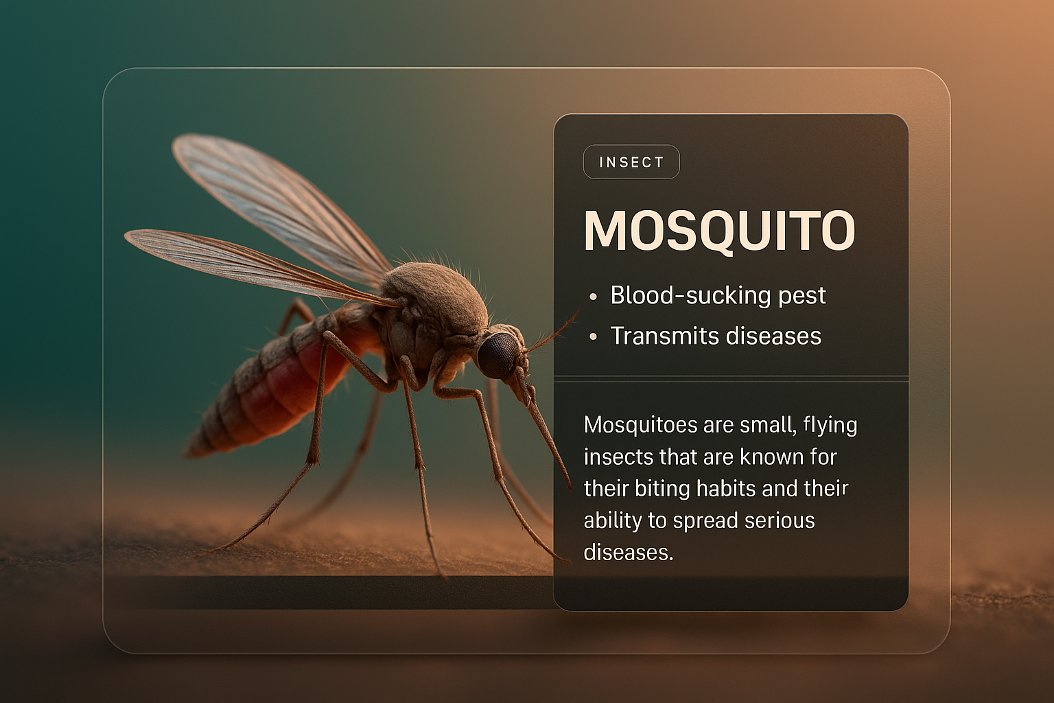 A detailed 3D illustration of a mosquito set against a gradient background. The image features an integrated dark overlay with information about mosquitoes, enhancing visual appeal.