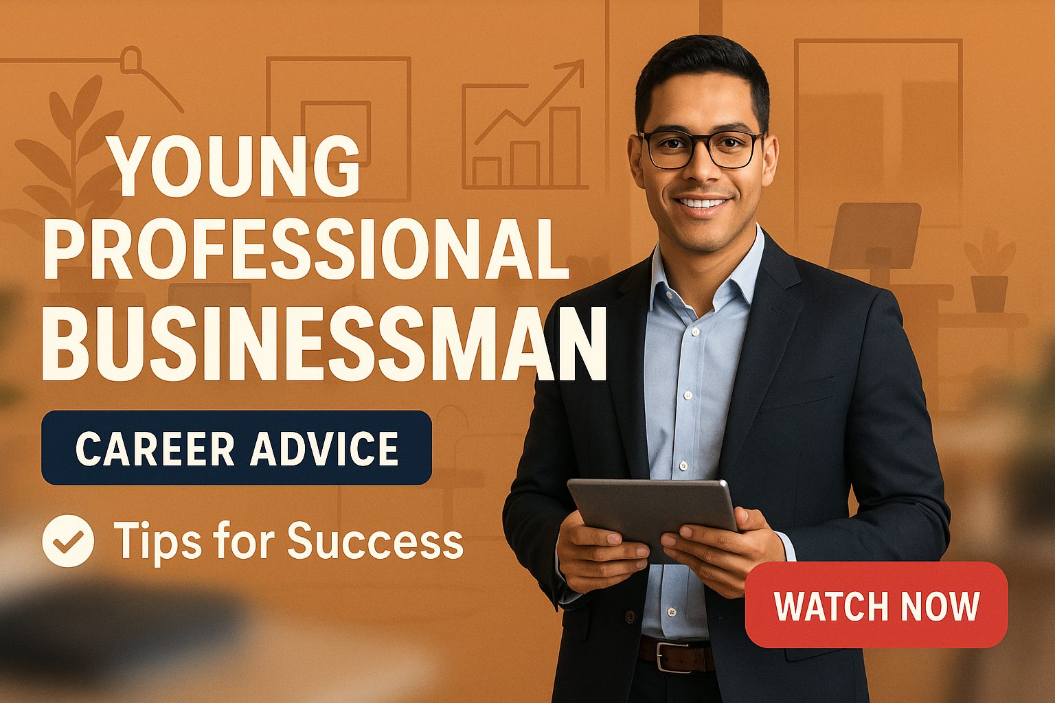 Engaging promotional graphic featuring a young professional businessman offering career advice, ideal for social media and digital marketing.