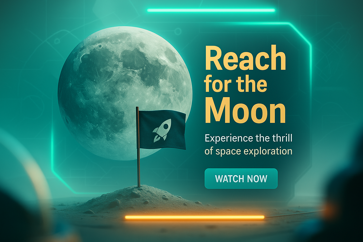 /Collection: /by davooda/Type: PNG/A promotional graphic highlighting the excitement of space exploration, featuring a prominent moon and a flag on the lunar surface. The modern, digital style is intended for online advertising.