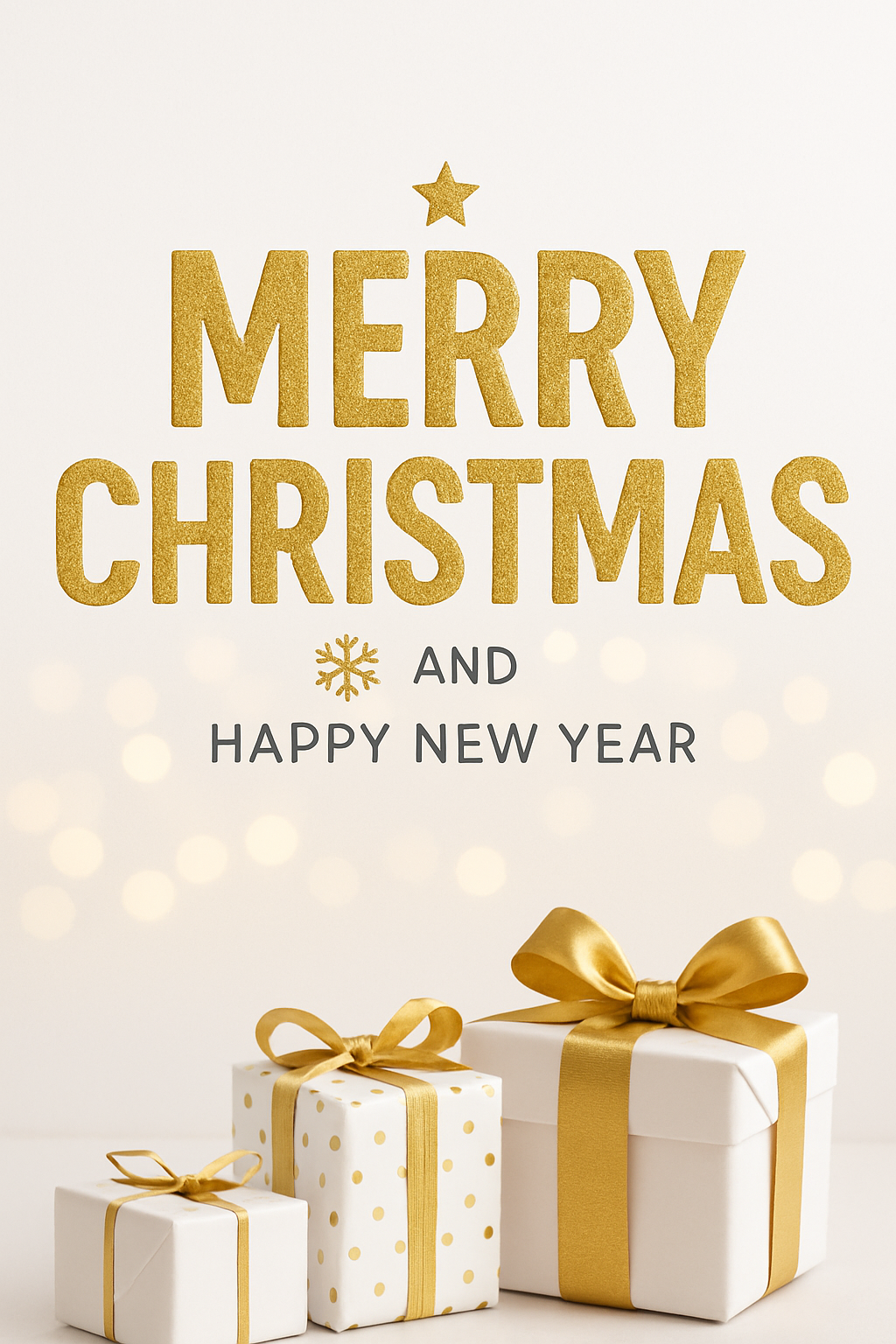 A cheerful holiday greeting card design featuring gold typography and wrapped gifts, ideal for seasonal greetings and festive promotions.