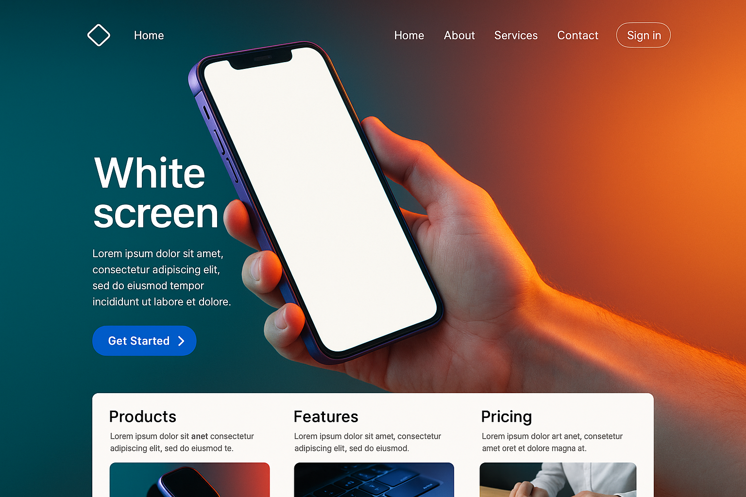 /Collection: /by davooda/Type: PNG/A vibrant landing page featuring a hand holding a purple phone with a white screen, showcasing various product blocks and a clear call-to-action button. The design emphasizes realism with dynamic lighting.