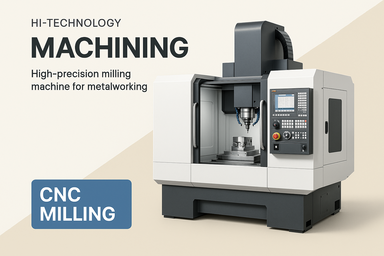 /Collection: /by davooda/Type: PNG/A modern advertisement showcasing a high-precision CNC milling machine. The design features a clean layout with contrasting light colors, realistic lighting, and bold typography emphasizing the machining technology.