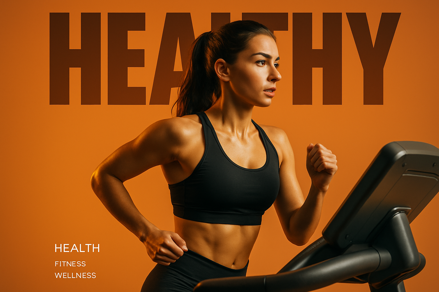 A fit woman is running on a treadmill in a gym, showcasing strength and determination. The bold word 'HEALTHY' dominates the background, creating a modern, cinematic feel.