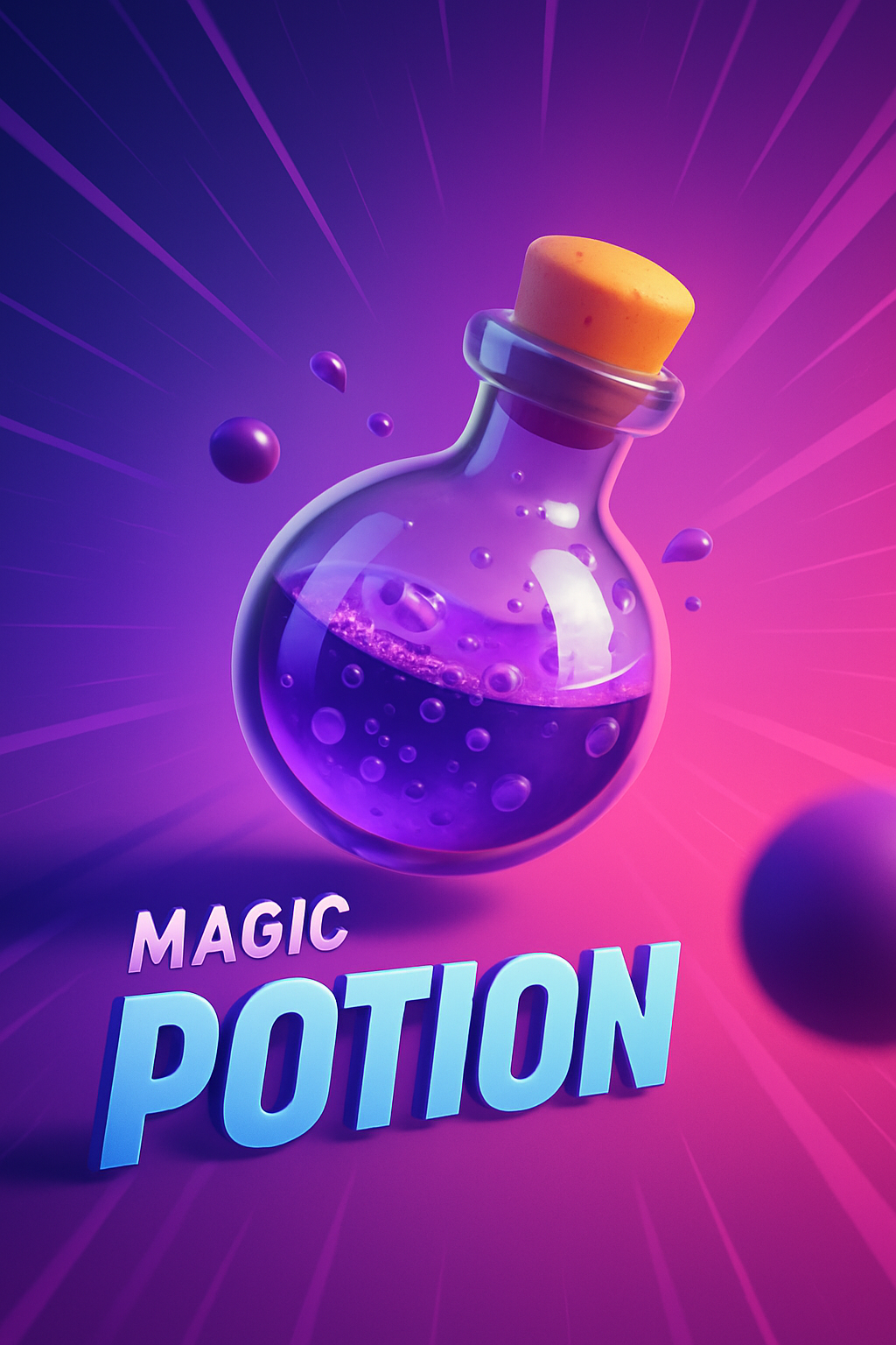 /Collection: /by davooda/Type: PNG/A vibrant 3D illustration of a magic potion in a glass bottle with a cork, featuring dynamic lines radiating from the center. The background transitions from gradient to solid color, creating an engaging visual effect.