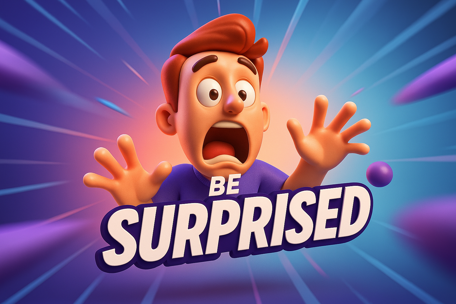 A vibrant 3D illustration featuring a surprised character with an expressive face. The background displays dynamic rays emanating from the center, creating a sense of movement and energy.