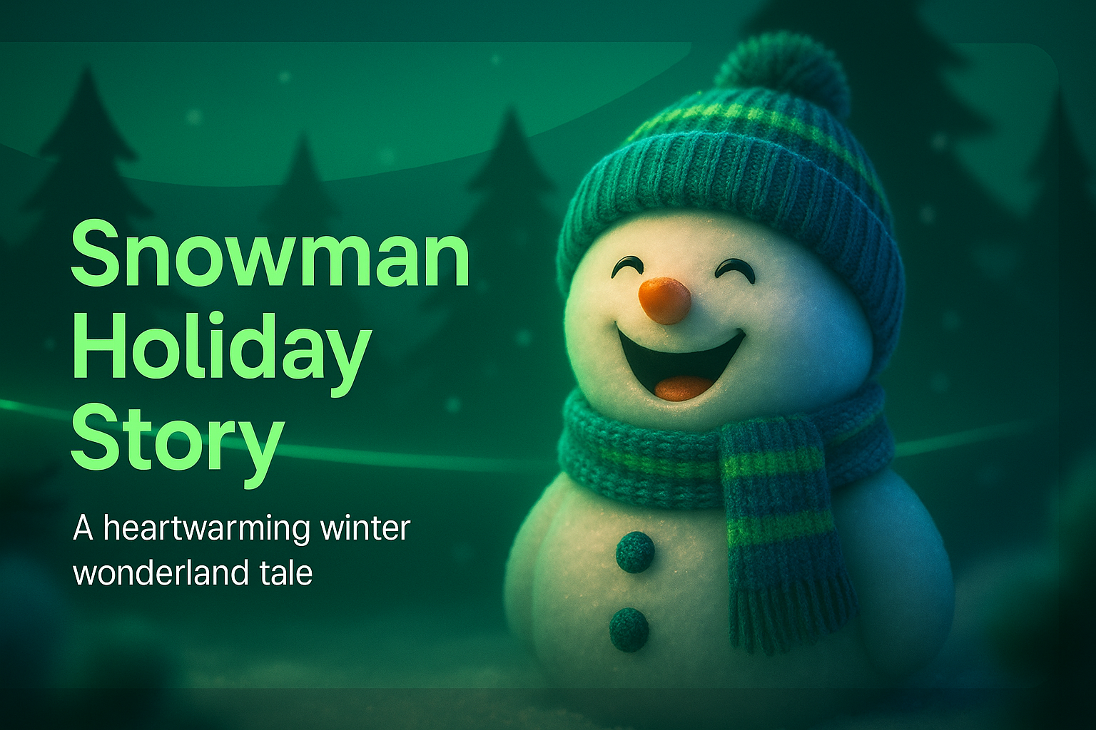 /Collection: /by davooda/Type: PNG/Charming illustration of a smiling snowman in a winter setting, designed for a holiday story promotion. Ideal for seasonal marketing and children's literature.