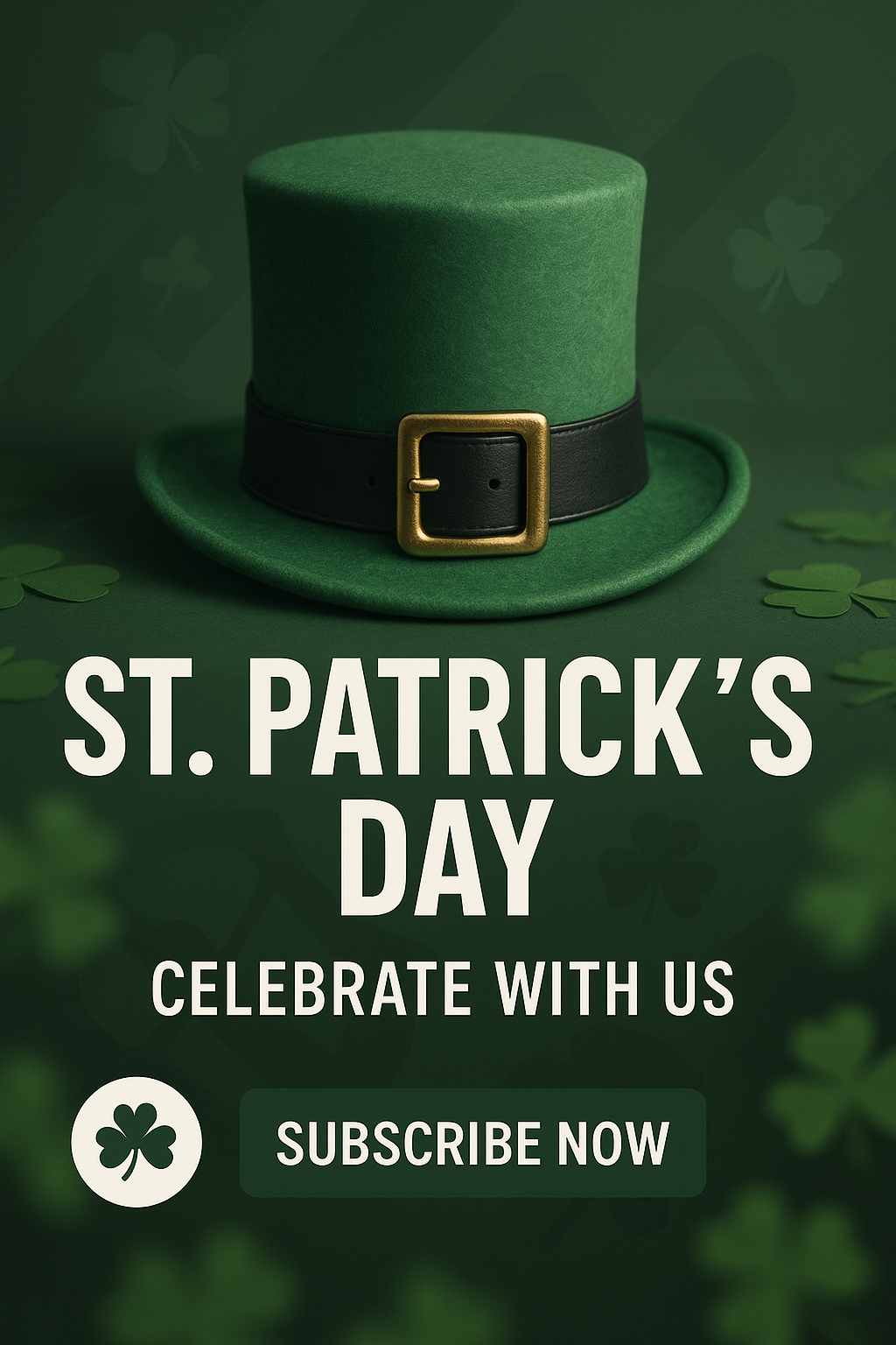 Promotional graphic featuring a green top hat and festive elements for St. Patrick's Day, perfect for social media or event marketing.