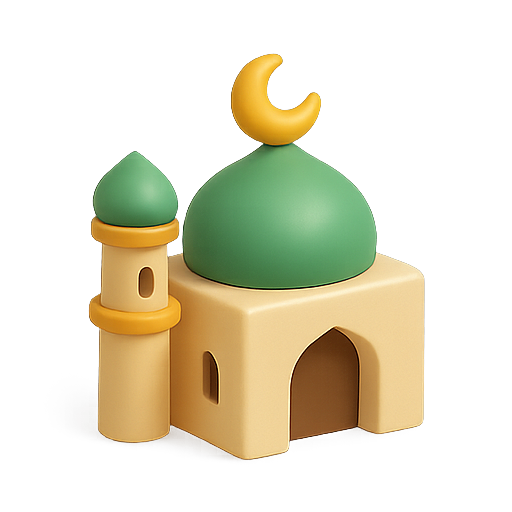 A playful 3D illustration of a mosque featuring a green dome and a crescent moon. Ideal for educational materials or cultural representations in digital formats.