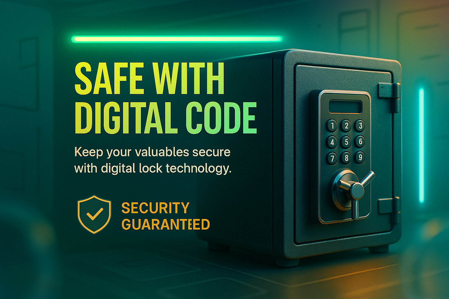 Promotional graphic showcasing a modern safe featuring digital lock technology, ideal for security product marketing. The design emphasizes safety and innovation.