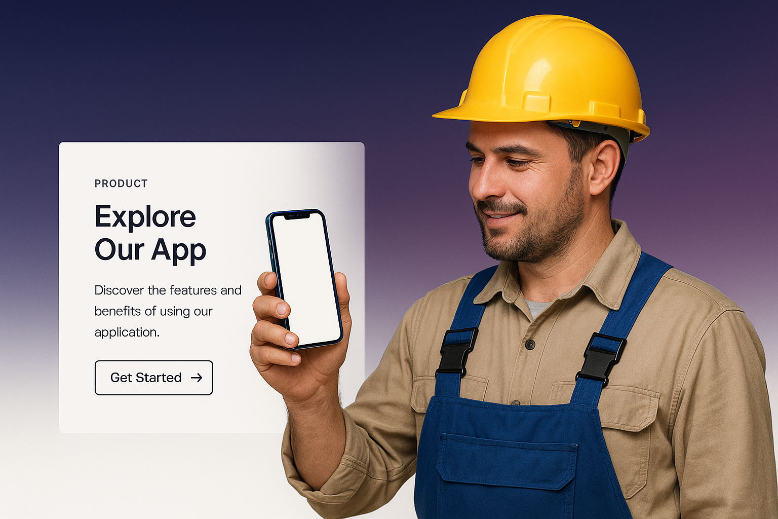 A construction worker in a yellow hard hat smiles while holding a smartphone. A promotional block next to him invites users to explore app features with a clear call to action.