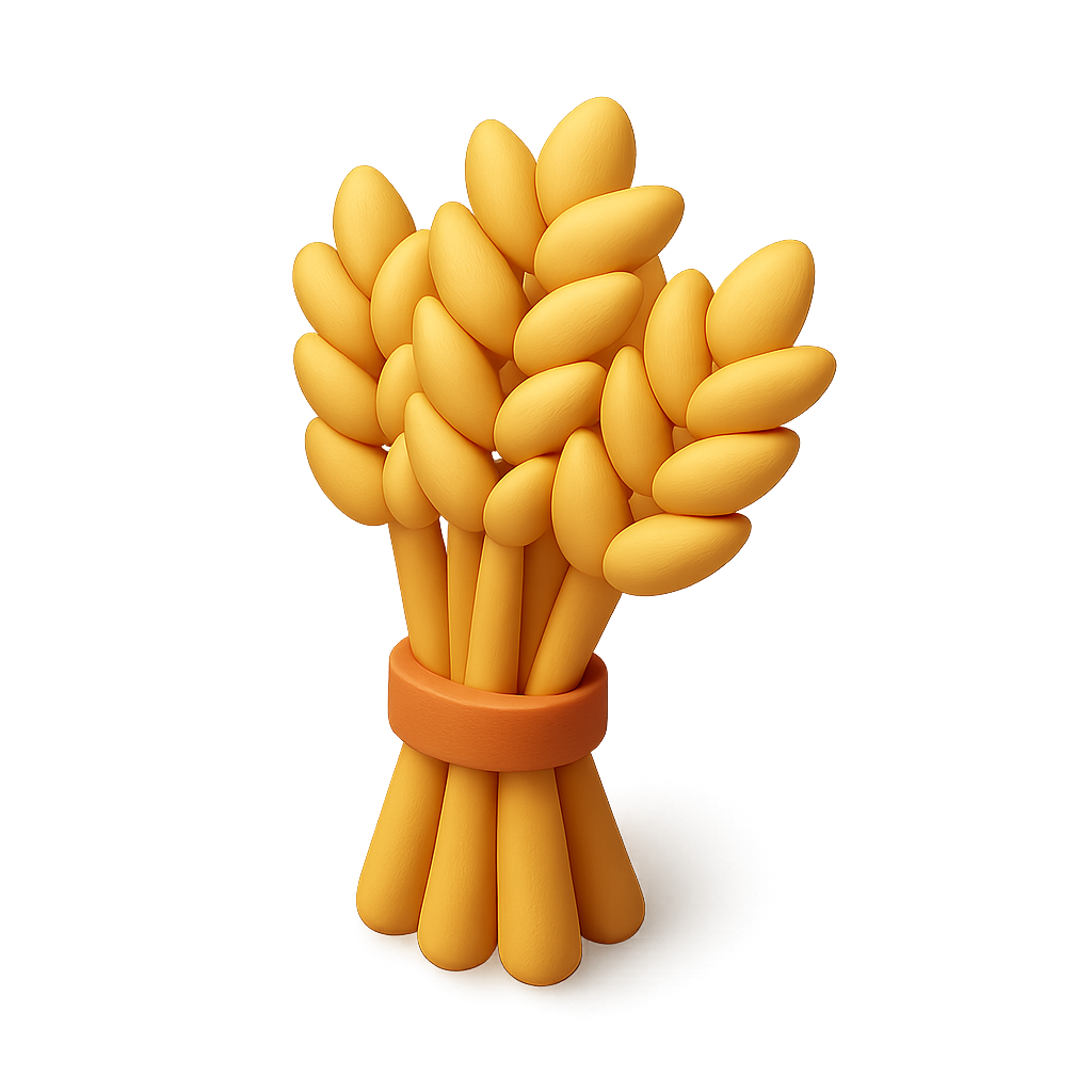 A vibrant 3D illustration of a bundle of wheat stalks tied with an orange band. The wheat is depicted in a cartoonish style, showcasing a bright yellow hue.