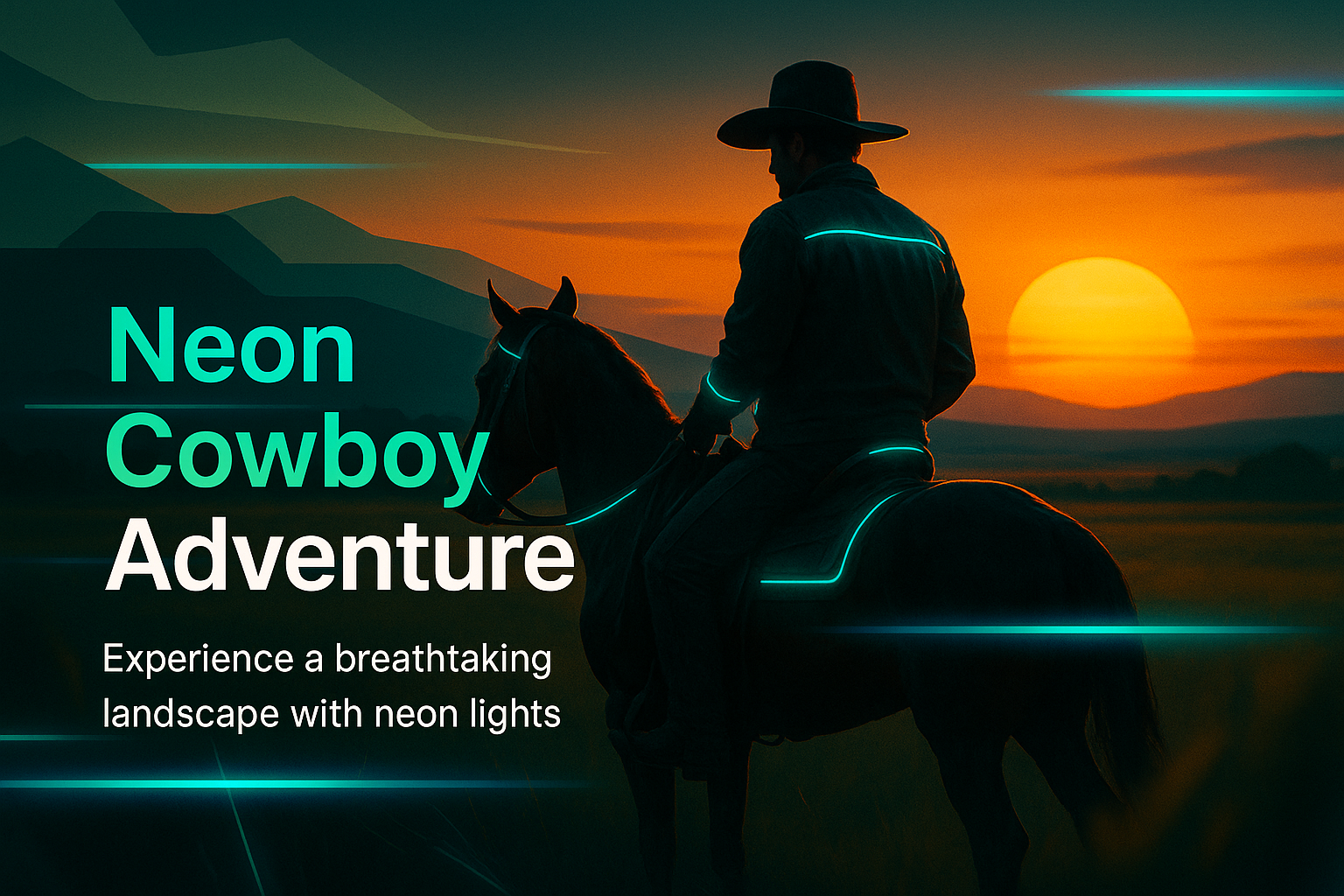 Dynamic digital artwork showcasing a cowboy on horseback against a stunning sunset, enhanced with neon light effects. Ideal for adventure-themed promotions.