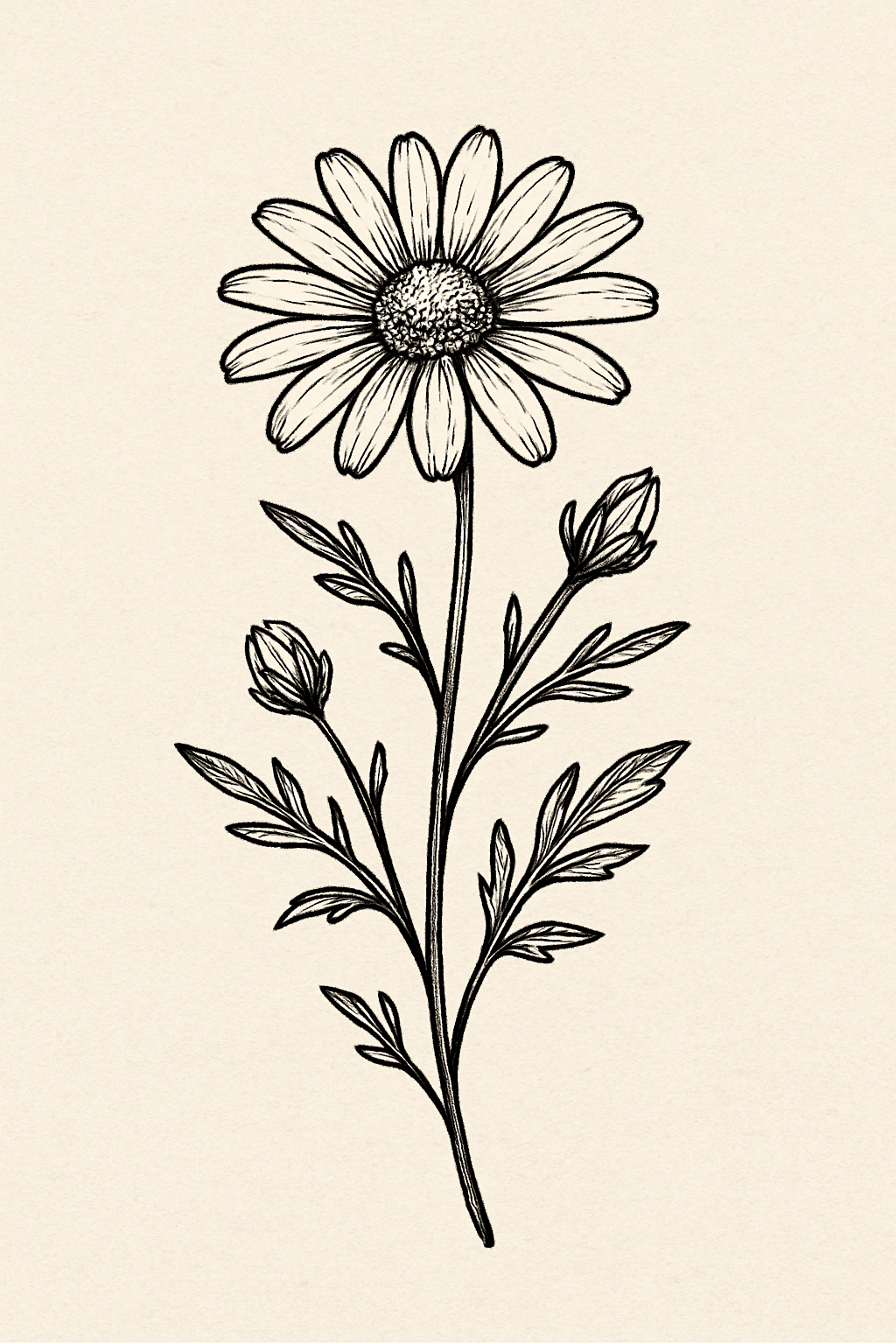 A hand-drawn style illustration of a daisy flower with accompanying buds and leaves. Ideal for botanical themes, art projects, or floral designs.