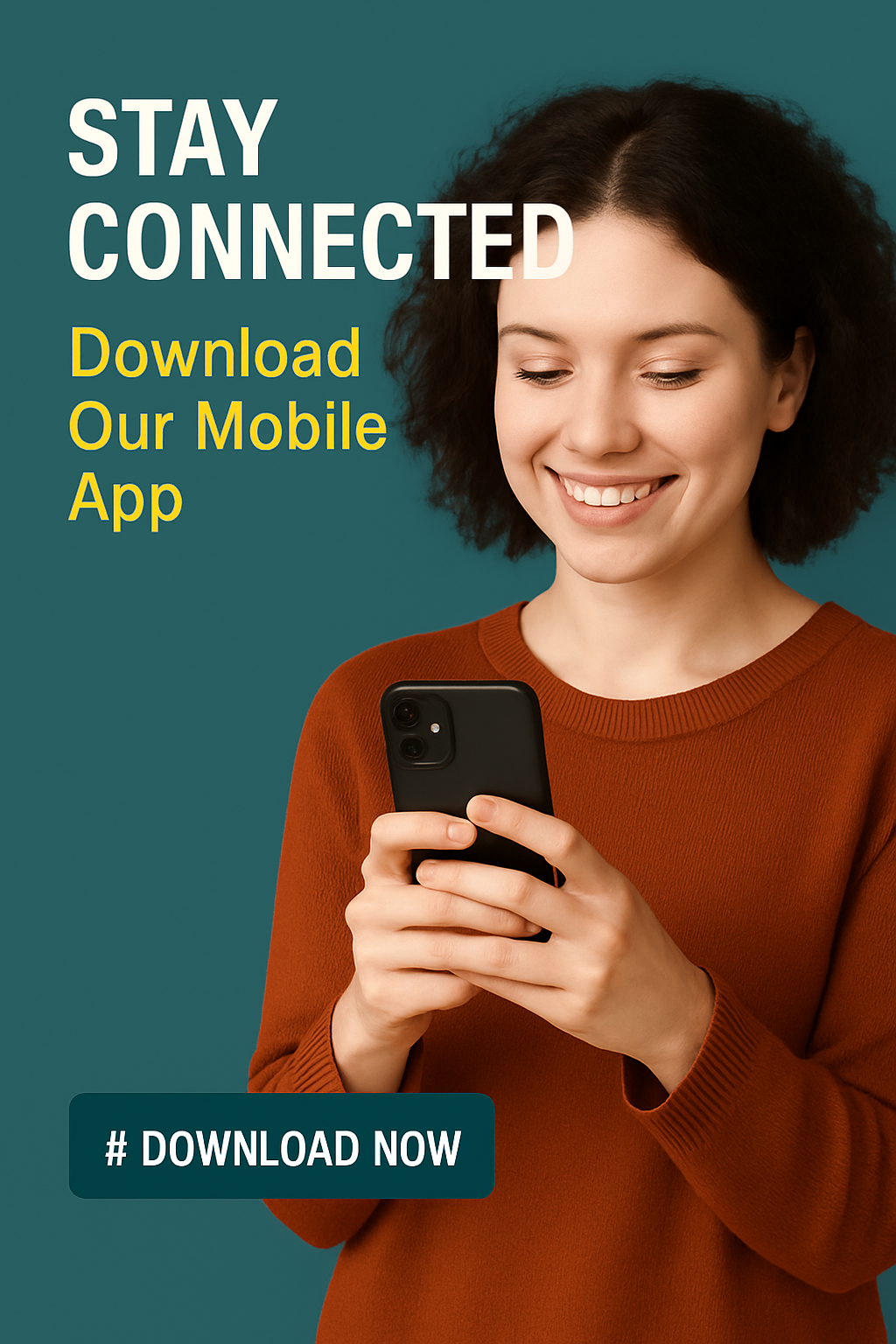 Engaging promotional graphic showcasing a young woman using a smartphone, encouraging app downloads. The modern and clean design targets tech-savvy audiences.