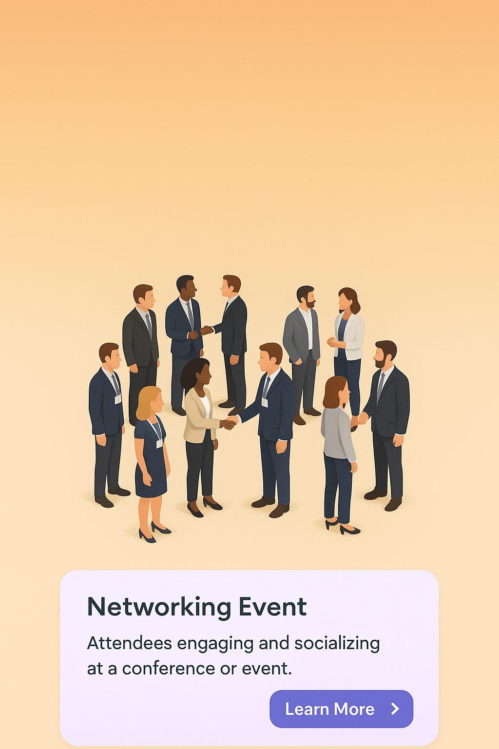 /Collection: /by davooda/Type: PNG/A vibrant 3D scene showing business professionals engaging and socializing at a networking event. The view is zoomed out, capturing the entire atmosphere of the conference with a smooth gradient background.