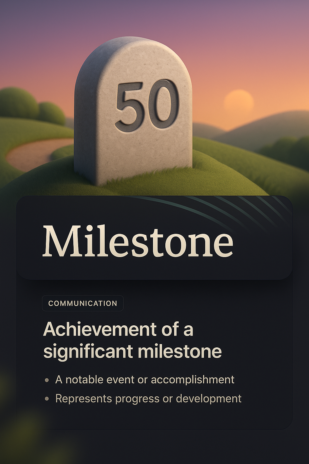 A 3D illustration depicting a milestone marked by the number 50 on a grassy hill, with a dark overlay featuring text highlighting its significance.