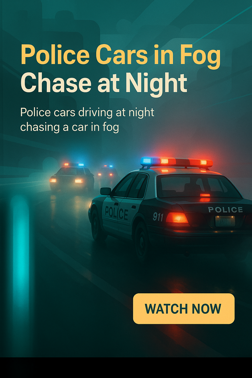 Engaging graphic depicting a nighttime police chase in fog, featuring illuminated police cars. Ideal for video thumbnails or action-themed content.