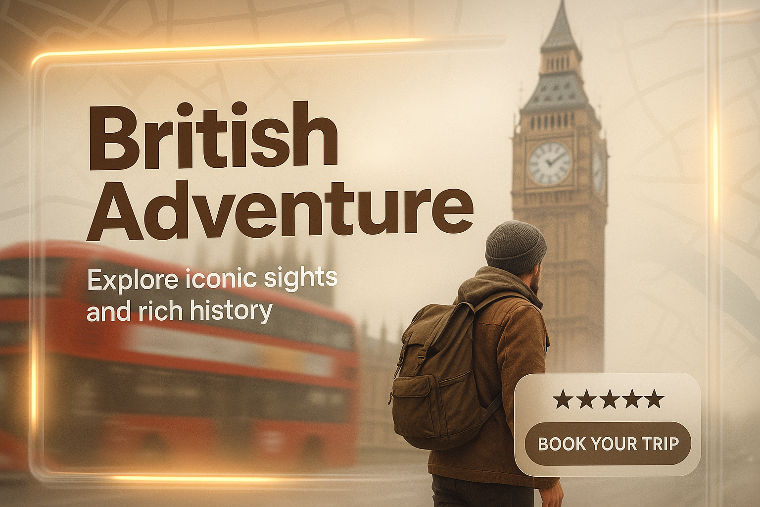 /Collection: /by davooda/Type: PNG/An inviting travel advertisement banner showcasing iconic British landmarks, designed to attract tourists interested in historical explorations. The warm tones and modern typography enhance its appeal.