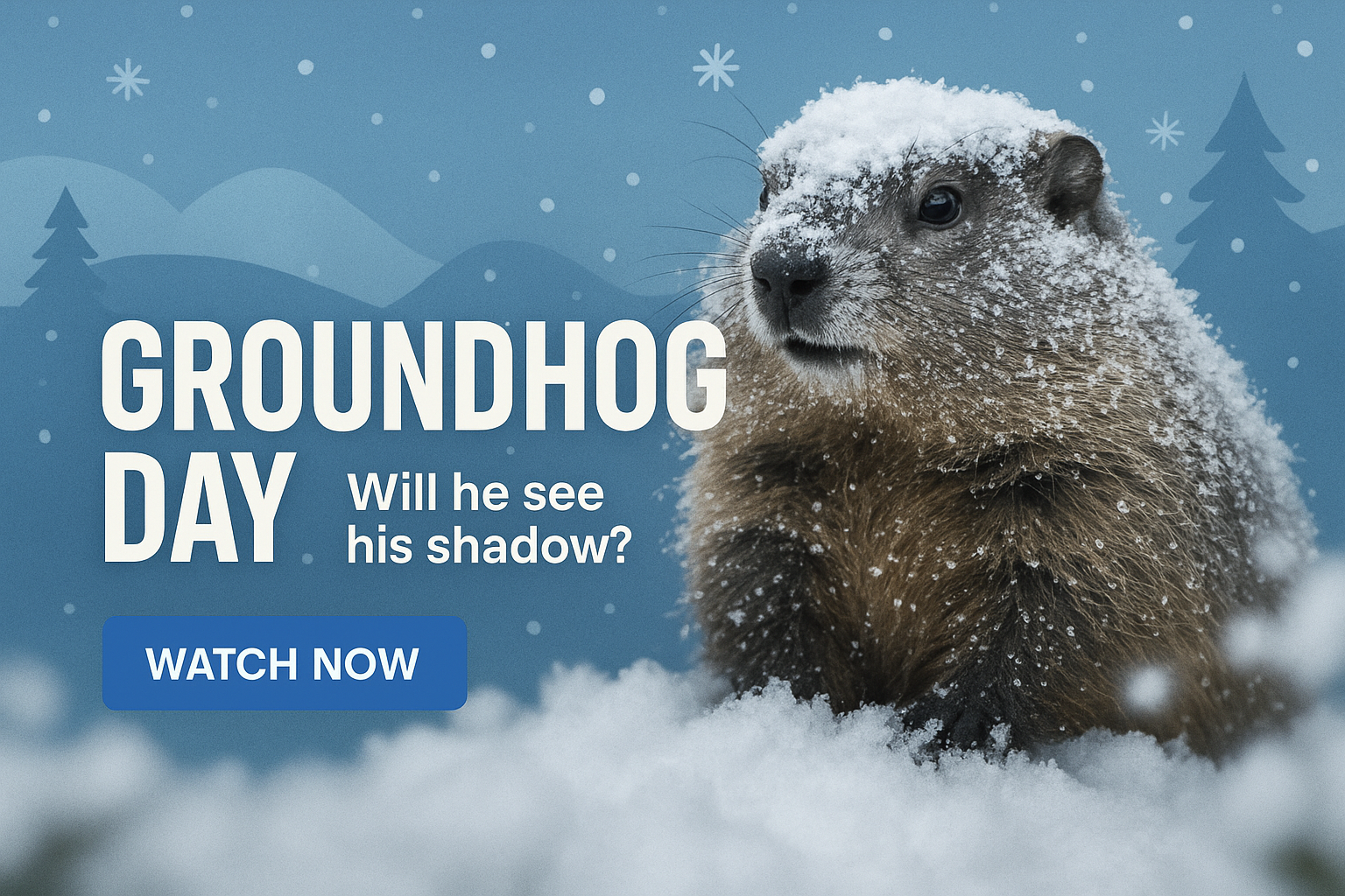 Groundhog Day Promotional Graphic Featuring a Snowy Groundhog