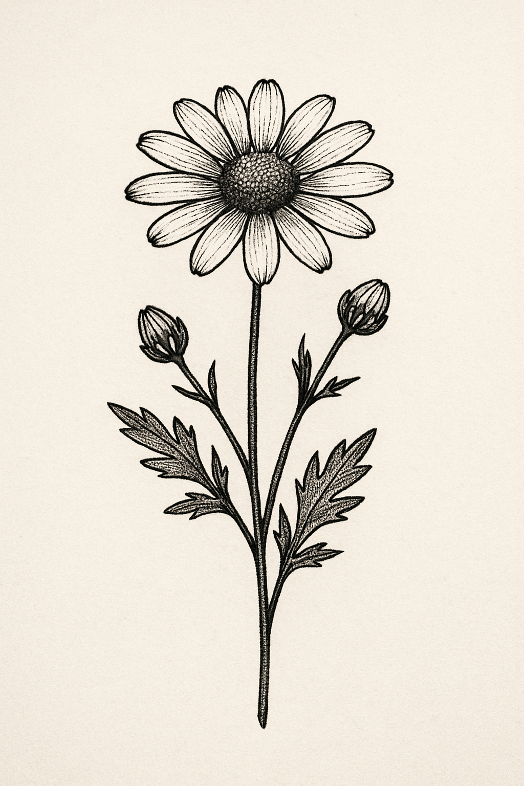 This image features a detailed black and white illustration of a daisy flower with buds. It is suitable for botanical art, design projects, or floral-themed content.