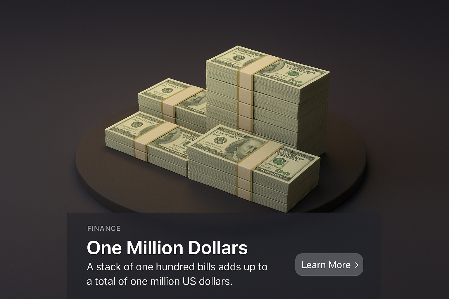 A zoomed-out, realistic 3D depiction of stacks of cash representing one million dollars. The dark gradient background enhances the vividness of the currency, making it visually striking.