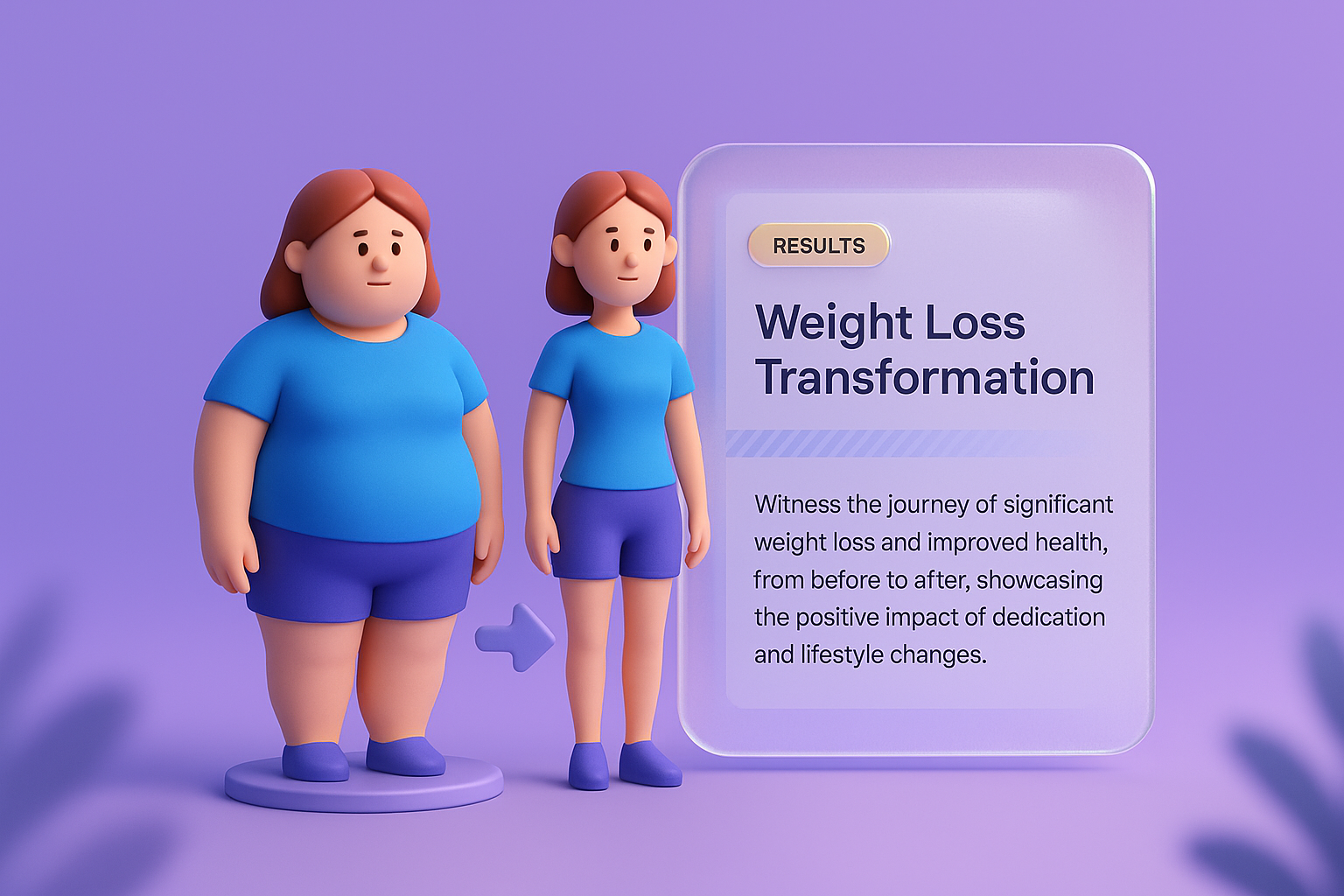 /Collection: /by davooda/Type: PNG/A vibrant 3D illustration depicting a weight loss transformation. The image showcases a character before and after their journey, with a stylish text box highlighting results and health improvements.