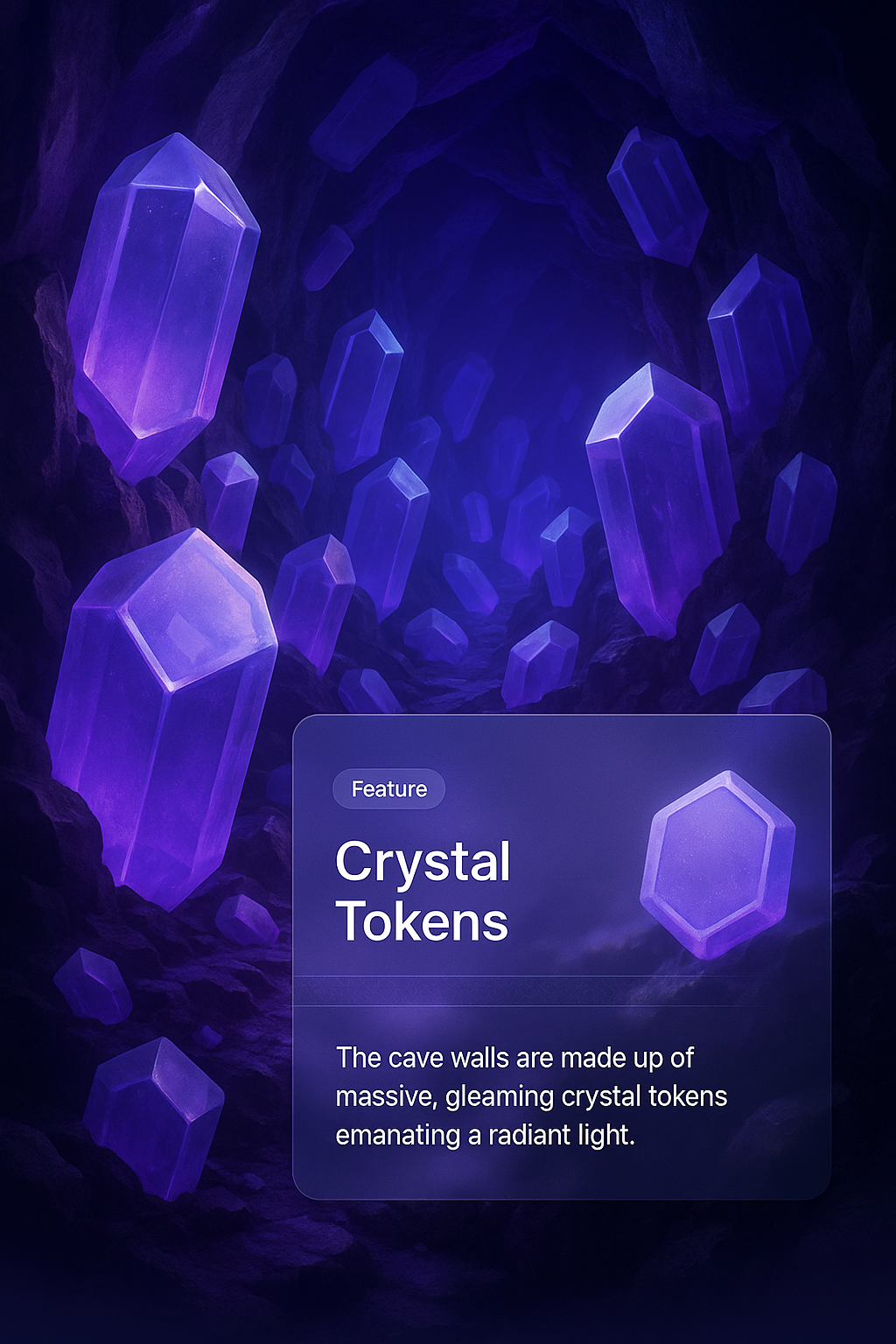 A stunning 3D illustration of a cave filled with luminous crystal tokens. The cave walls shimmer with the glow of massive, gleaming crystals, creating an enchanting atmosphere.