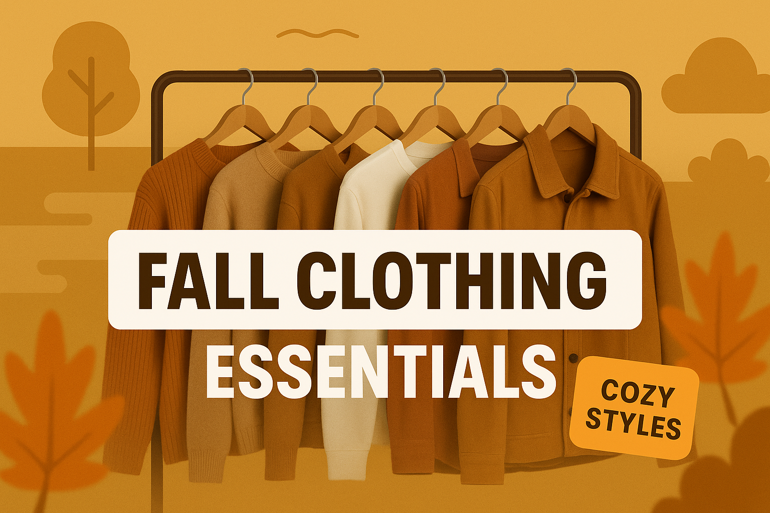 Stylish graphic showcasing fall clothing essentials on hangers with warm color palette, ideal for fashion retail marketing and social media promotion.