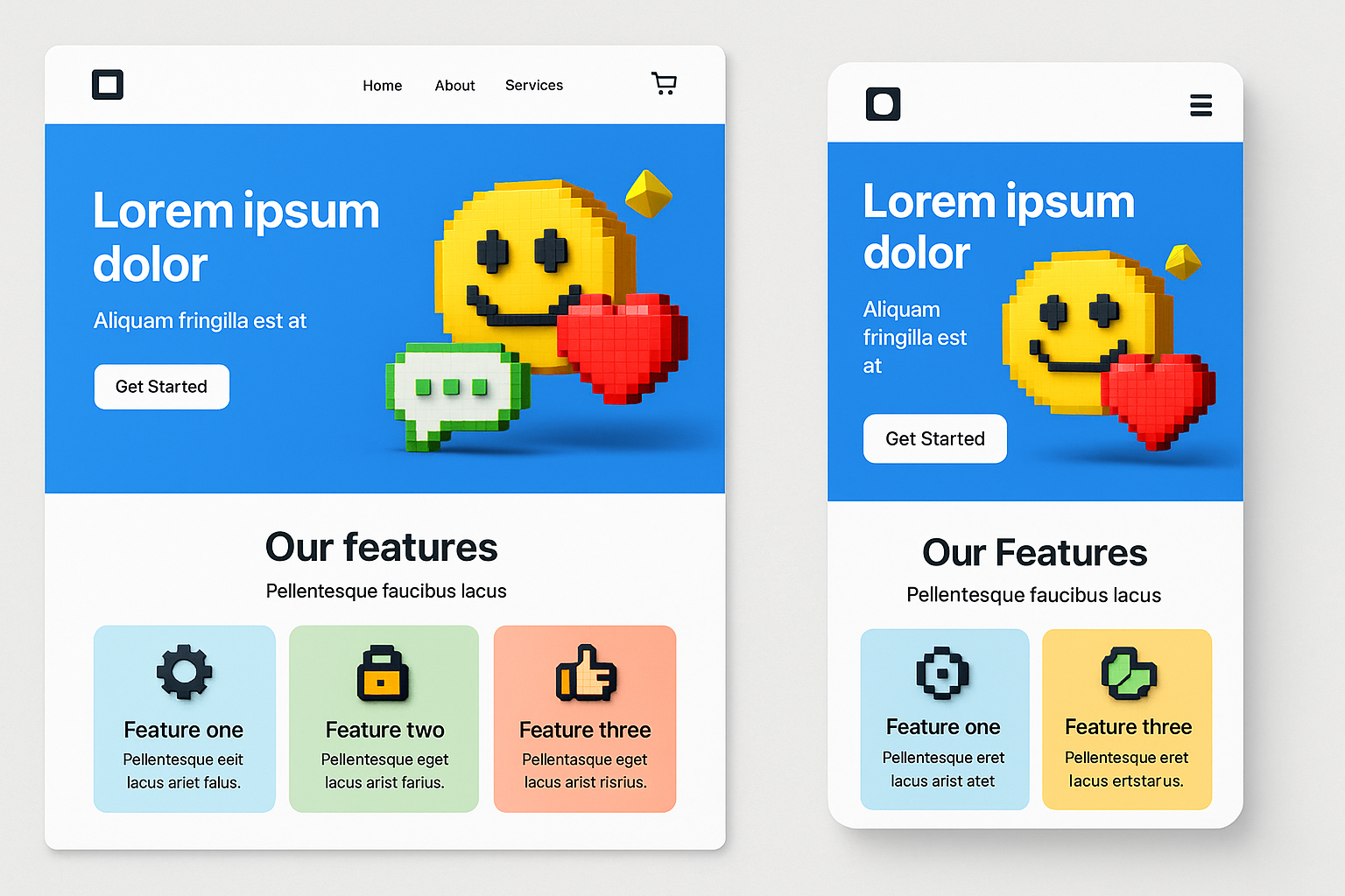 This image features mobile and desktop versions of a website, showcasing a clean design with 3D elements and pixel art icons. The layout emphasizes clarity and balance.