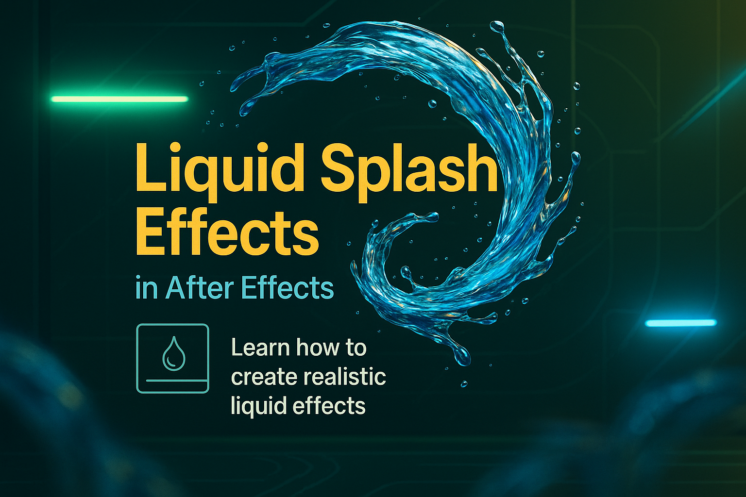 Engaging graphic showcasing a tutorial on creating realistic liquid splash effects in After Effects, featuring vibrant colors and modern design elements suitable for digital art education.
