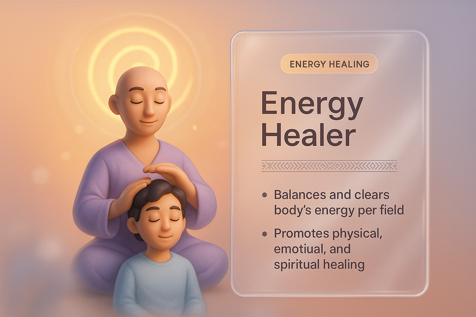 /Collection: /by davooda/Type: PNG/A serene 3D illustration depicting an energy healer performing a healing session on a person. The image features a soft gradient background, a transparent label with healing benefits, and a calming atmosphere.