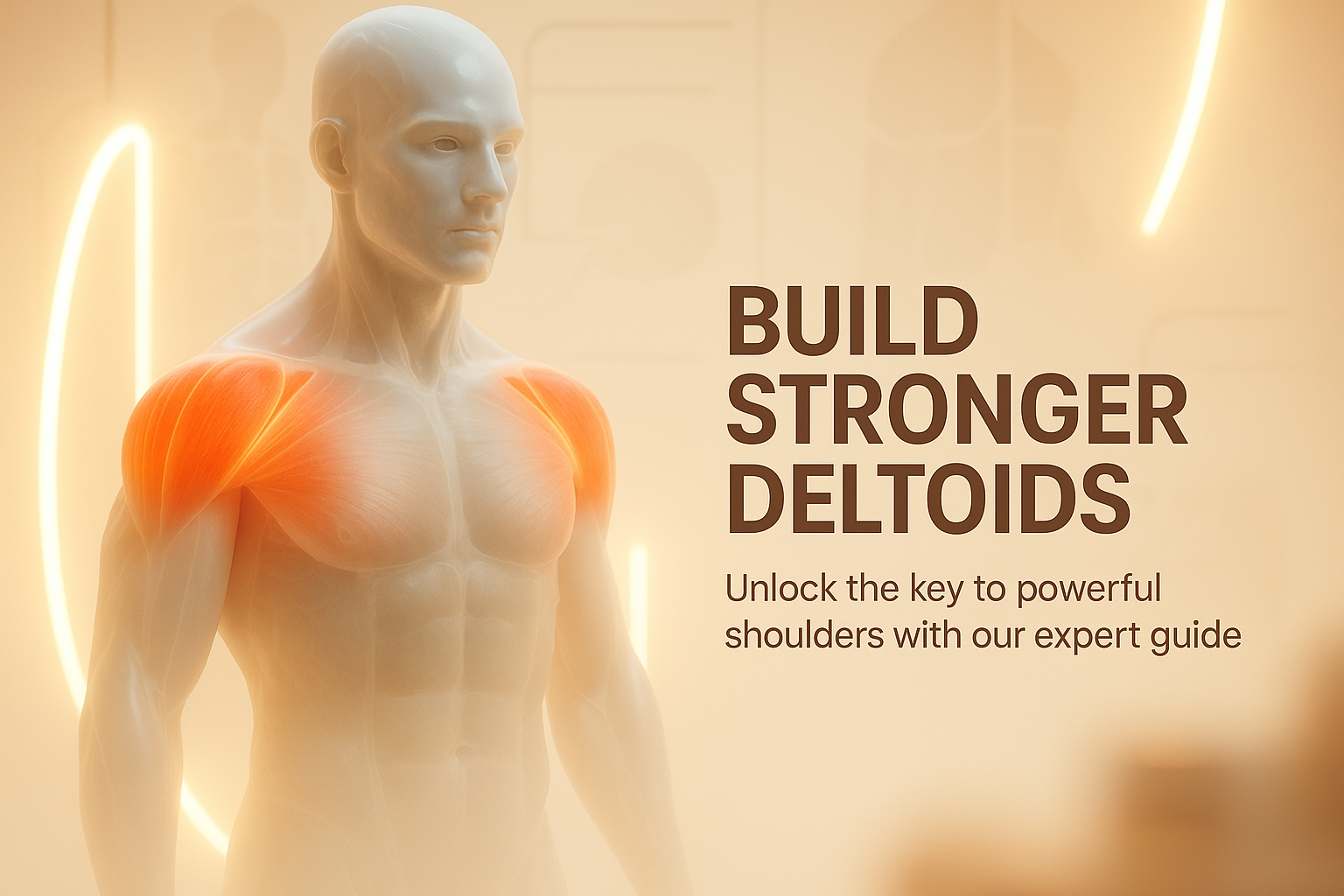 /Collection: /by davooda/Type: PNG/Promotional image for a fitness guide focusing on strengthening deltoid muscles. Features a stylized anatomical figure with highlighted shoulder areas, ideal for fitness enthusiasts.