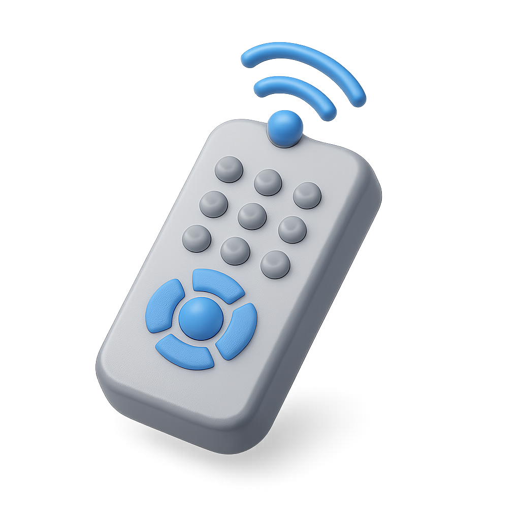 /Collection: /by davooda/Type: PNG/A stylized 3D remote control icon presented in a three-quarter view, featuring a sleek design with blue buttons and a wireless signal above, all set against a transparent background.