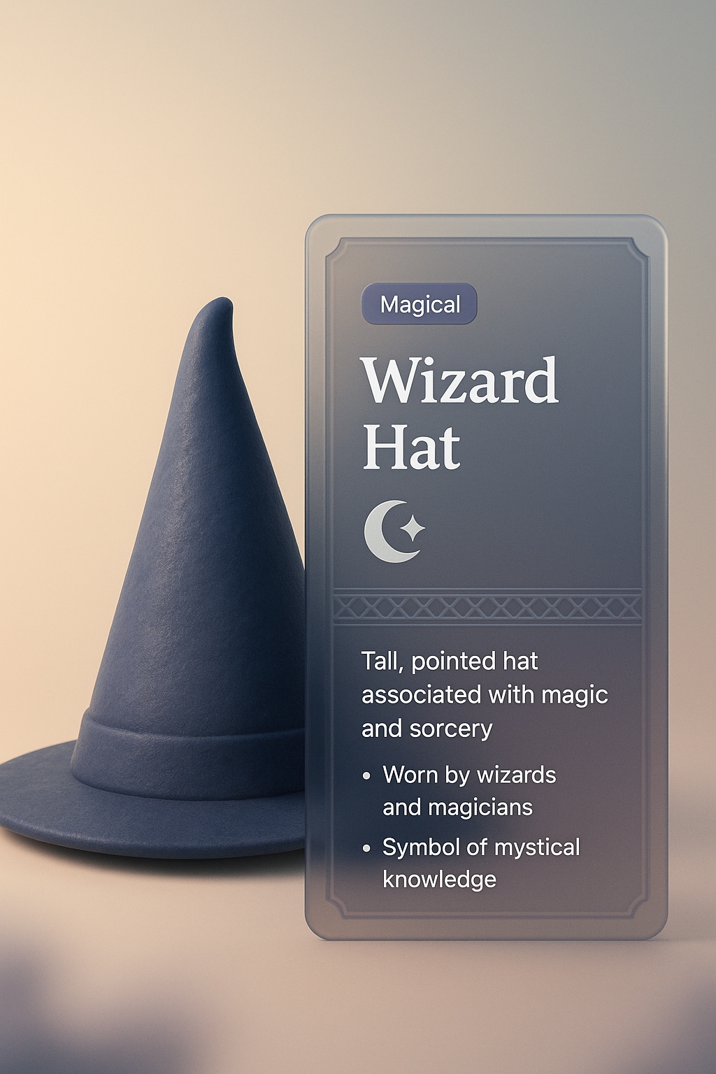 A 3D illustration of a tall, pointed wizard hat set against a soft gradient background. Accompanied by a stylish overlay that integrates text elegantly.