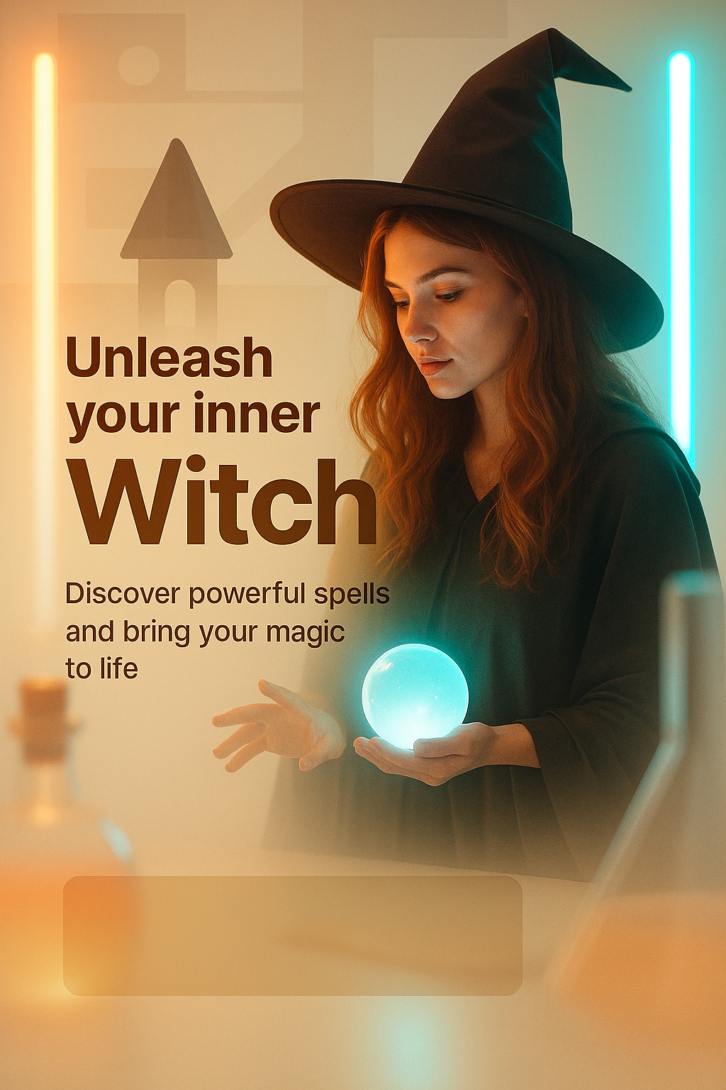 /Collection: /by davooda/Type: PNG/A captivating scene featuring a witch holding a glowing orb, surrounded by neon lights and soft fog. The design combines realism with vibrant colors, emphasizing the magical theme.