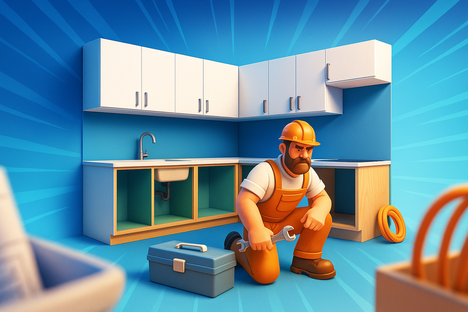 /Collection: /by davooda/Type: PNG/A vibrant 3D illustration of a kitchen being prepared for installation, featuring a focused worker in a hard hat and tools. The background radiates energy with bold colors and dynamic lines.