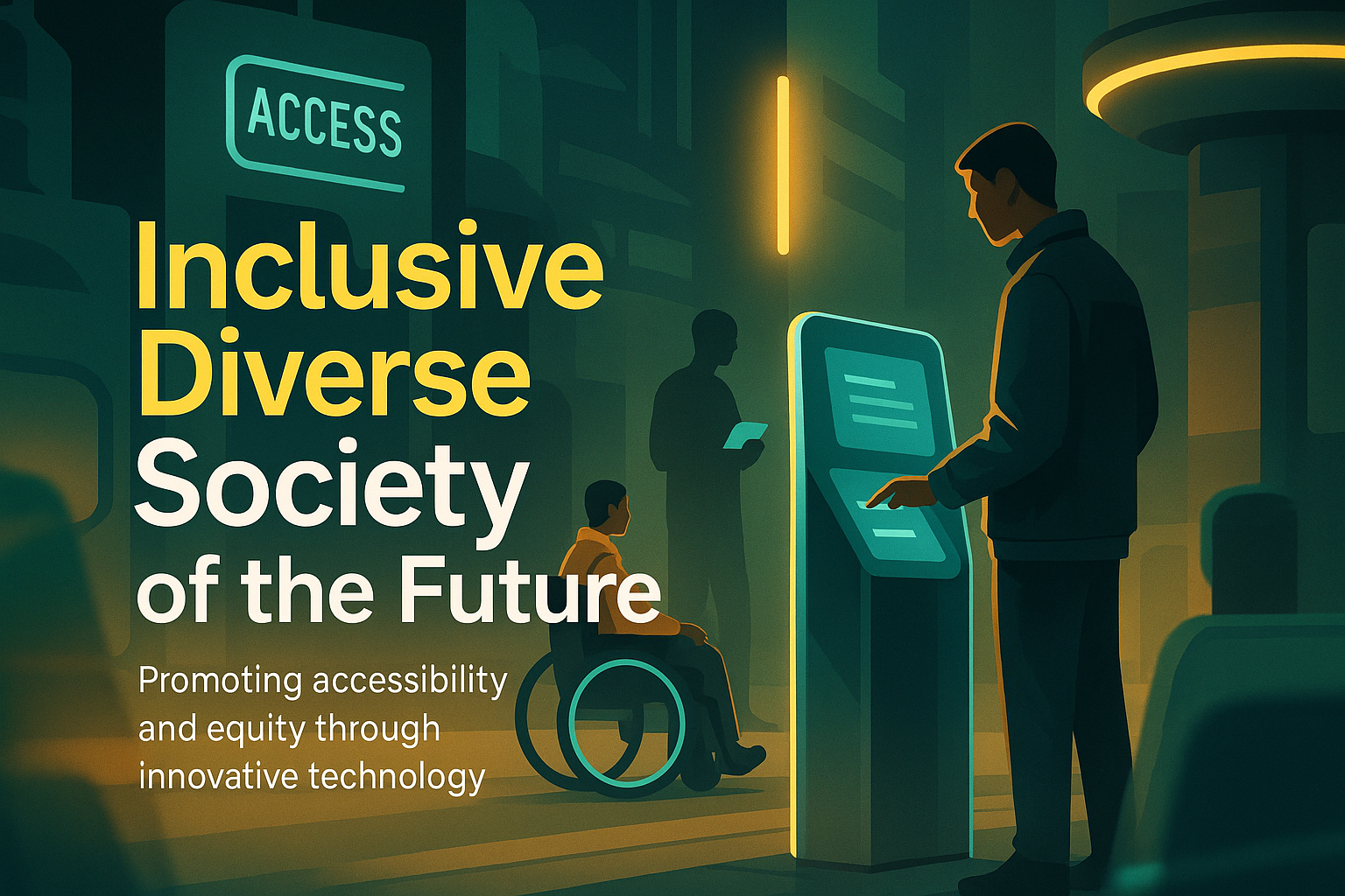 /Collection: /by davooda/Type: PNG/A visually striking graphic that emphasizes the themes of accessibility and equity in future technology, showcasing a diverse society. Ideal for educational or promotional use.