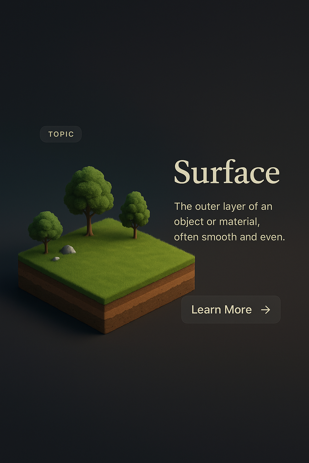 /Collection: /by davooda/Type: PNG/A visually appealing 3D depiction of a surface theme featuring small trees and grass, set against a dark gradient background. The design includes informative text and a call-to-action button.