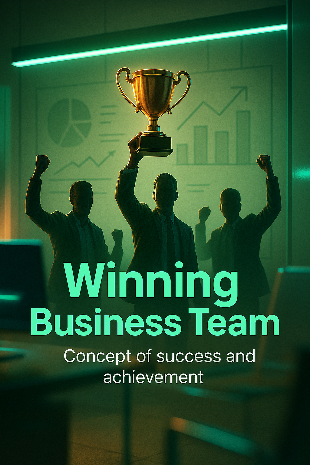 /Collection: /by davooda/Type: PNG/A visually striking image showcasing a business team celebrating their success with a trophy. The use of silhouettes and a modern office background conveys a sense of achievement and motivation, ideal for motivational content or corporate presentations.